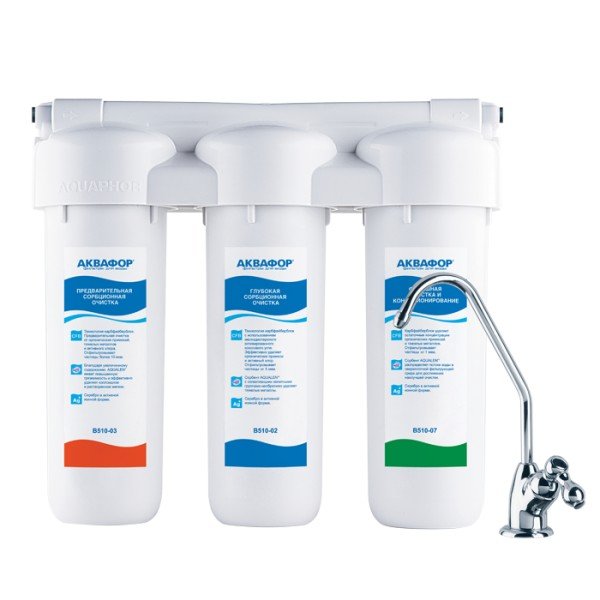 Обратноосмотические фильтры используются для абсолютной защиты от накипи, т.к. полностью устраняют соли жесткости из воды.нетЧисло ступеней очисткиКартриджи последовательно очищают воду и от видимых примесей, и от растворенных. Первый картридж задерживает более крупные частицы, а каждый последующий - более мелкие. Чем больше ступеней - тем лучше фильтр очистит воду: поймает более мелкие видимые частицы ржавчины, песка и ила, успеет захватить из воды максимум растворенных примесей - хлора, нитратов, тяжелых металлов и других.3Механическая фильтрацияЗадерживает ржавчину, ил, песок, как “сито”. Если в фильтре несколько картриджей - первый отсекает самые крупные частицы, а каждый последующий - более мелкие. Существуют картриджи, в которых есть только механическая очистка (полипропиленовые, не “впитывают” растворенные примеси). Они обычно стоят первыми по ходу воды, чтобы продлить жизнь угольным (сорбционным) картриджам, которые ещё и впитывают вредные примеси, как губка.даИонный обменНужен, чтобы умягчать воду, а также задерживать тяжелые металлы. За это отвечают ионно-обменная смола и Аквален (волокна, которые есть во всех фильтрах Аквафор, чтобы устранять тяжелые металлы даже из жесткой воды). Чем больше ионно-обменной смолы - тем лучше фильтр справится с жесткостью. В небольшом количестве она есть во всех фильтрах под мойку. Если же в фильтре есть отдельный картридж, заполненный такой смолой (например, KH), - фильтр помогает умягчать воду. Для слишком жесткой воды (более 5 мкв) лучше выбрать фильтр обратного осмоса.даСорбцияСпособность “впитывать” из воды растворенные, “невидимые” вредные примеси, по принципу губки. Активированный уголь - основной сорбционный материал, который используется в картриджах фильтров для питьевой воды. Например, именно так из воды удаляется хлор.даУмягчениеУдаление из воды солей жесткости (солей кальция и магния, из-за которых образуется накипь в чайнике, белые пятна на посуде, известковый налет). Фильтры обратного осмоса абсолютно умягчают воду с любой концентрацией солей (то есть удаляют соли жесткости полностью). Проточные фильтры со специальными картриджами рекомендуются только для умягчения воды средней жесткости (той, в которой средняя концентрация солей кальция и магния - до 5 млэкв/литр).нетМинерализацияПроисходит после финишной очистки воды. Необходима прежде всего в фильтре обратного осмоса, поскольку такой фильтр полностью устраняет из воды все примеси, в том числе минералы. Минералы добавляются в оптимальной концентрации - для пользы и привычного вкуса воды.нетПостфильтрацияФинальный этап очистки воды: картриджи постфильтрации удаляют самые мелкие механические частицы и кондиционируют воду, придавая ей более приятный вкус.нетПрименениедля холодной водыНакопительная емкостьОбычно нужна в фильтрах обратного осмоса. Глубокая фильтрация требует времени. Чтобы Вам не приходилось ждать, пока вода наберется в чайник или кастрюлю, почти во всех моделях используется накопительный бак для чистой воды или другая емкость. В стандартном фильтре обратного осмоса под мойку воды в баке достаточно для семьи из 5-6 человек.нетФильтрует частицы крупнее, мкмЧем меньше цифра, тем более мелкие частицы способен задержать фильтр. Например, любой фильтр под мойку справится с ржавчиной, илом и 