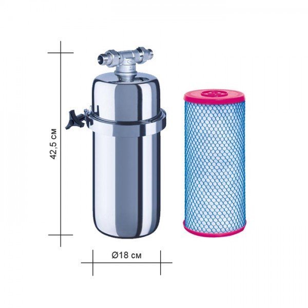 Не забывайте учитывать и срок службы фильтра: он указан в паспорте и определяет, когда модуль нужно заменить, даже если ресурс активной фильтрации в литрах еще есть.30000Вес, кг (нетто) изделия5,8Высота, смОбратите внимание на габариты фильтра и измерьте, сколько свободного пространства в предполагаемом месте установки.42,5Механическая фильтрацияЗадерживает ржавчину, ил, песок, как “сито”. Если в фильтре несколько картриджей - первый отсекает самые крупные частицы, а каждый последующий - более мелкие. Существуют картриджи, в которых есть только механическая очистка (полипропиленовые, не “впитывают” растворенные примеси). Они обычно стоят первыми по ходу воды, чтобы продлить жизнь угольным (сорбционным) картриджам, которые ещё и впитывают вредные примеси, как губка.даСорбцияСпособность “впитывать” из воды растворенные, “невидимые” вредные примеси, по принципу губки. Активированный уголь - основной сорбционный материал, который используется в картриджах фильтров для питьевой воды. Например, именно так из воды удаляется хлор.даФильтрует частицы крупнее, мкмЧем меньше цифра, тем более мелкие частицы способен задержать фильтр. Например, любой фильтр под мойку справится с ржавчиной, илом и песком, но не каждый - с бактериями (на это способен картридж с половолоконной мембраной и системы обратного осмоса). Если в фильтре несколько картриджей - первый отсекает самые крупные частицы, а каждый последующий - более мелкие. Цифра указана для картриджа самой тонкой очистки.5,0Фильтрующий модуль в комплектедаДавление в водопроводе не более, атмМаксимальное давление воды на входе в систему, при котором возможна стабильная работа фильтра.6,5Ширина, смОбратите внимание на габариты фильтра, и измерьте, сколько свободного пространства в предполагаемом месте установки.18,0Глубина, смОбратите внимание на габариты фильтра, и измерьте, сколько свободного пространства в предполагаемом месте установки.18,0Защита корпуса от гидроударовдаСкорость фильтрации, л/минСкорость подачи отфильтрованной воды из крана чистой воды на мойке. Например, при скорости фильтрации 2,5 литра/минуту стакан 200 мл. наполнится меньше, чем за 10 секунд.15,0КомплектацияГотовый фильтр состоит из корпуса и картриджа для очистки воды. Если вы приобретаете только корпус, необходимо отдельно купить подходящий к нему картридж: это может быть картридж для механической очистки воды от ржавчины, картридж для глубокой очистки воды от хлора.готовый фильтрВодаКартриджи и корпуса фильтров рассчитаны на определенную температуру воды. Данные технические характеристики важно учитывать, поскольку от этого зависит качество очистки и срок службы фильтра.горячаяМатериал корпусаПищевой пластик: Допущен к контакту с пищевыми продуктами. Нержавеющая сталь: Долговечный и безопасный корпус из нержавеющей пищевой стали.нержавеющая стальОчисткаМеханическая очистка: Задерживает ржавчину, ил, песок, как “сито”. В корпусе предфильтра с механической очисткой установлен полипропиленовый модуль. Глубокая очистка: Подходит, чтобы купать детей в чистой воде. Делает прием душа и умывание более приятным. Фильтр глубокой очистки воды во всей квартире не только останавливает ржавчину, ил, песок, но и впитывает растворенные опасные примеси, как губка. Удаляет из воды хлор, хлорорганические вещества, п